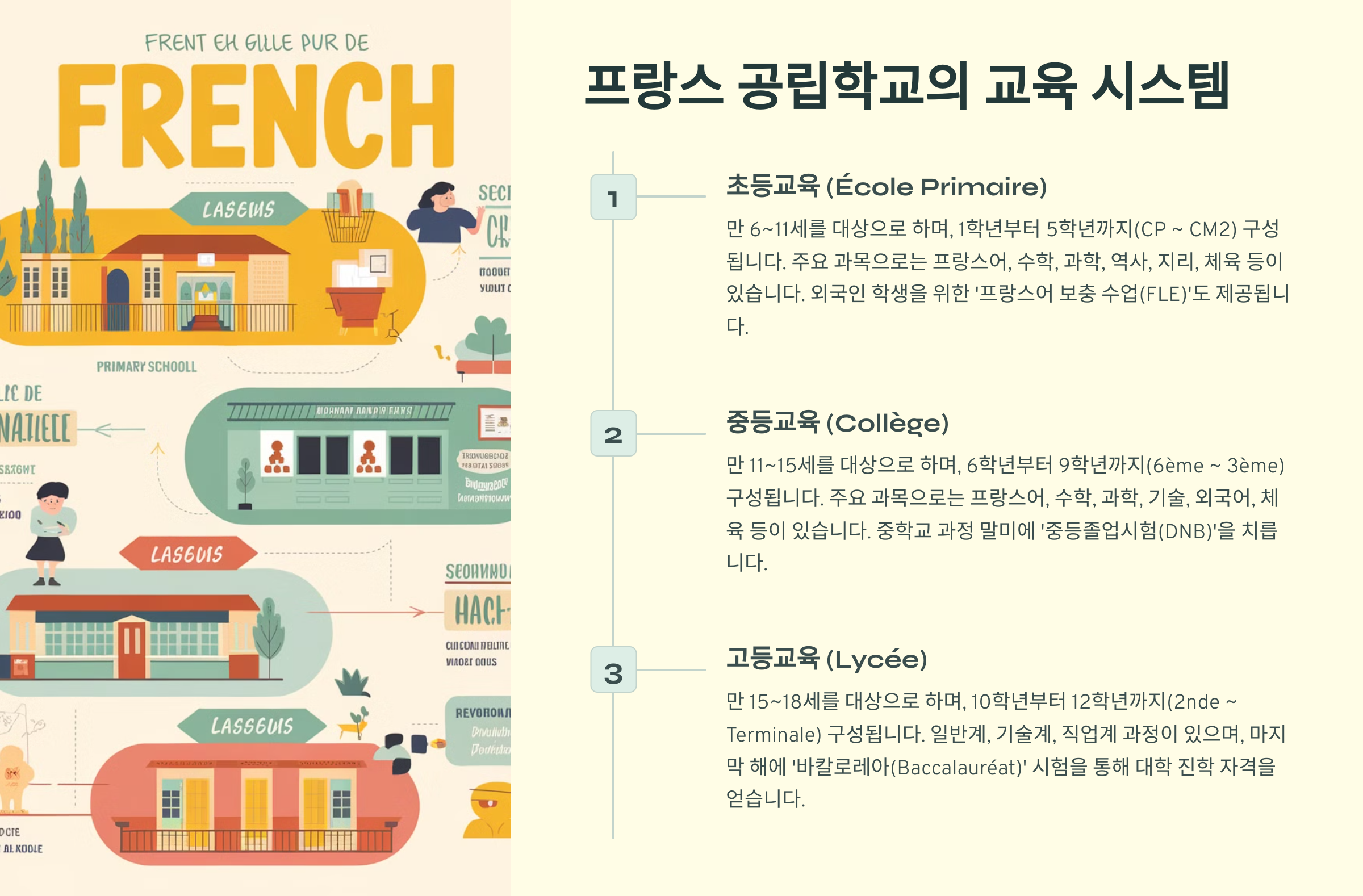 프랑스의 교육 시스템은 세 단계로 나뉘며, 각 단계마다 명확한 교육 목표와 커리큘럼이 있습니다.