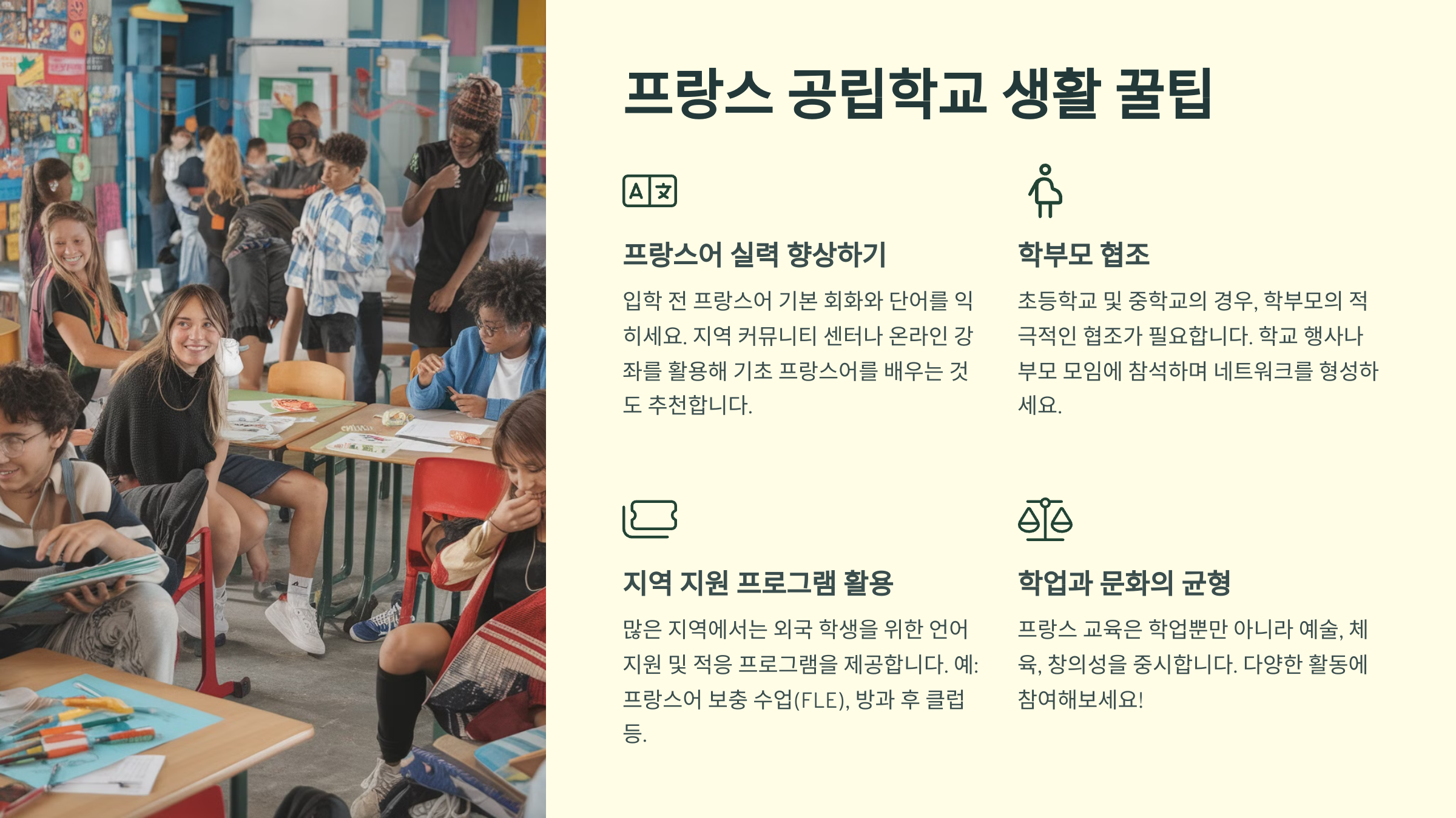 - 프랑스 공립학교에서는 수업이 대부분 프랑스어로 진행되므로, 기본적인 프랑스어 학습을 시작하는 것이 좋습니다.
