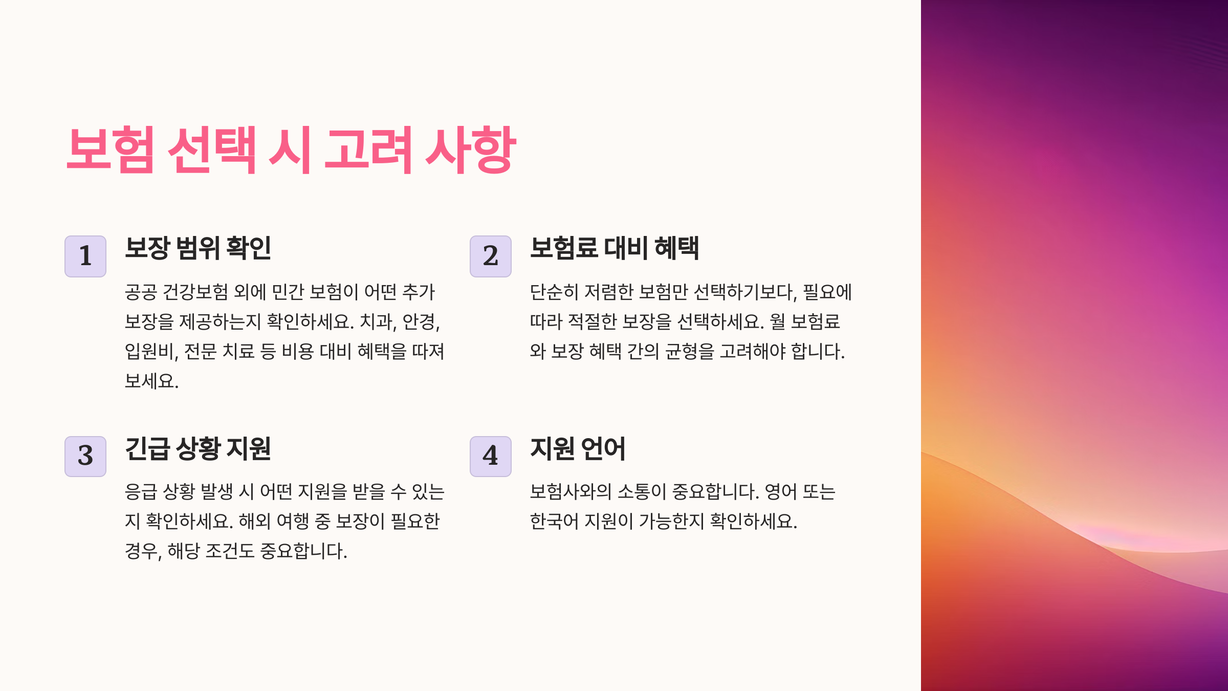 Tip: 민간 보험은 선택 사항이지만, 예산과 건강 상태를 고려해 가입하는 것이 좋습니다.