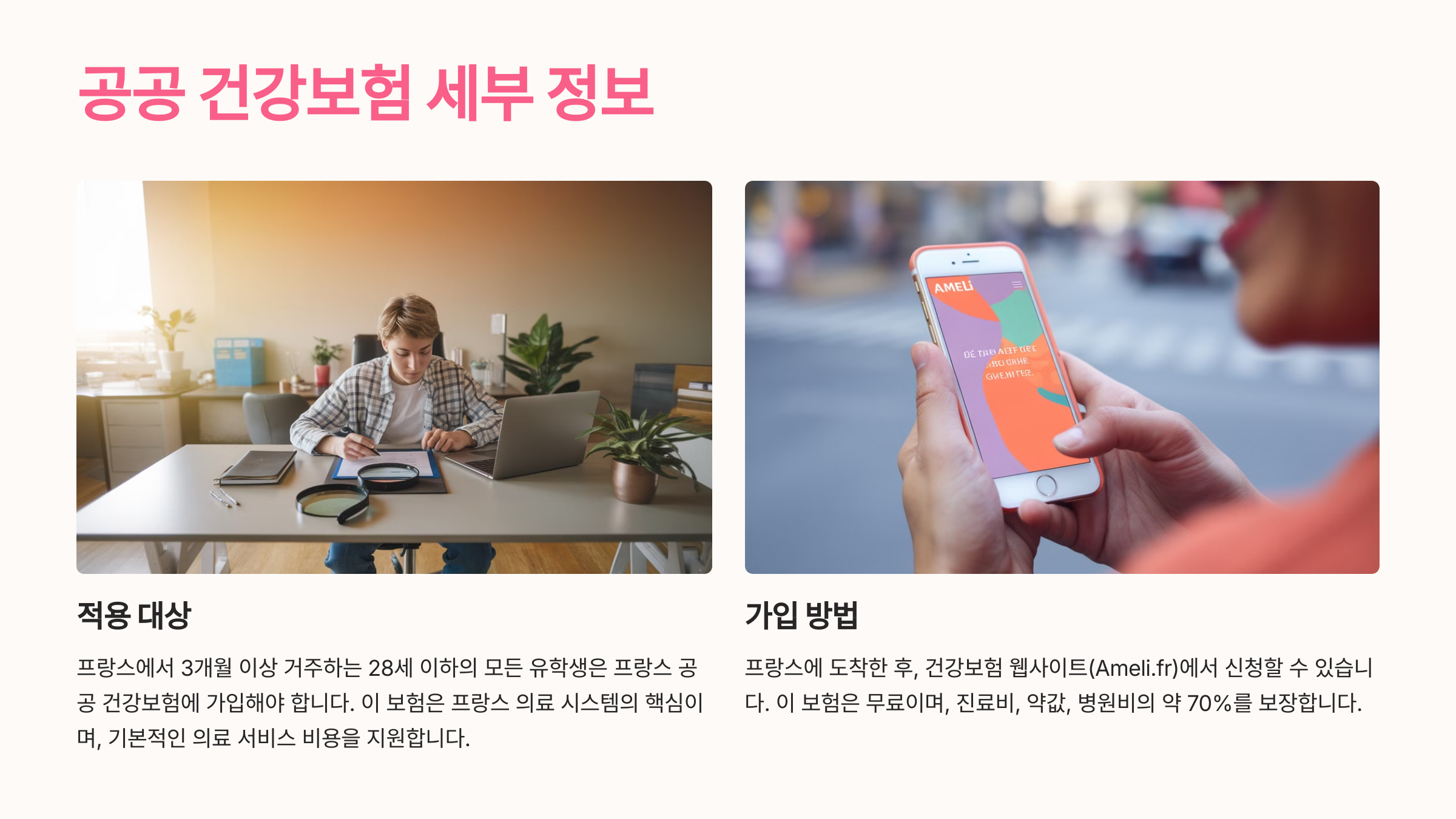 - 가입 방법: 프랑스에 도착한 후, 건강보험 웹사이트(Ameli.fr)에서 신청