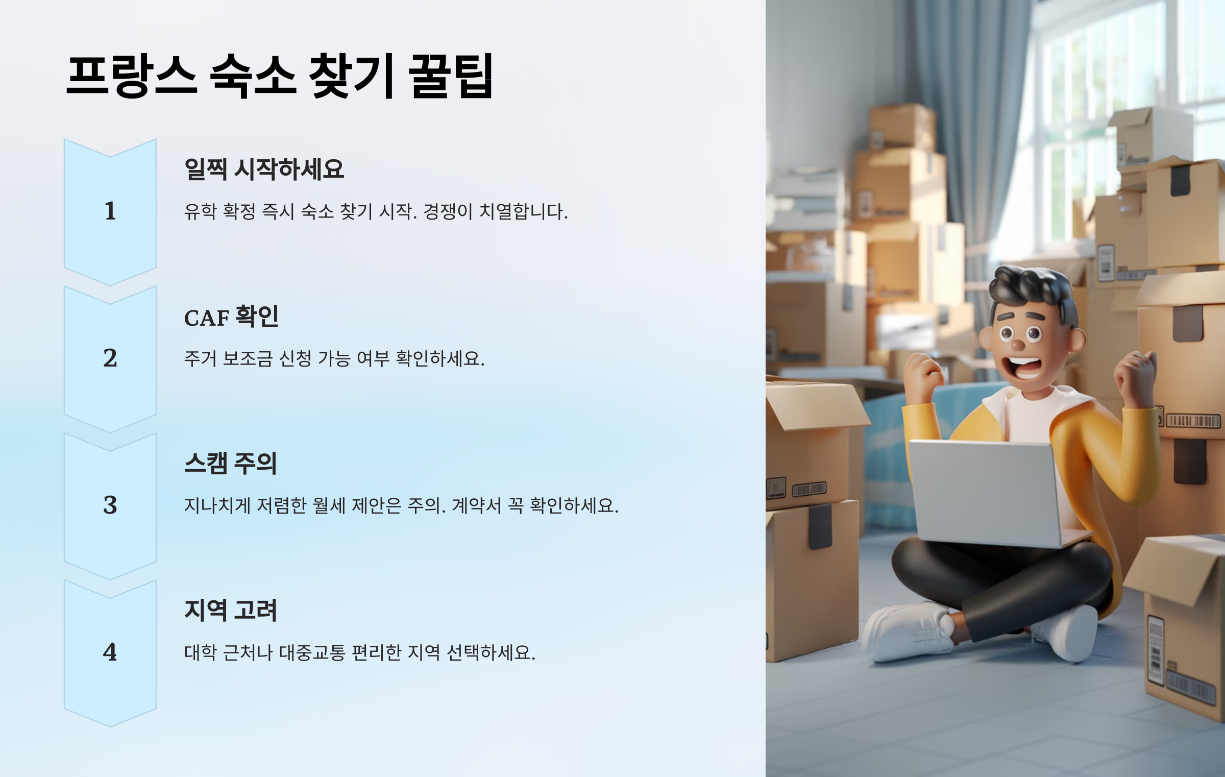 - 프랑스는 숙소 경쟁이 매우 치열하므로, 유학이 확정되면 가능한 한 빨리 숙소를 찾으세요.