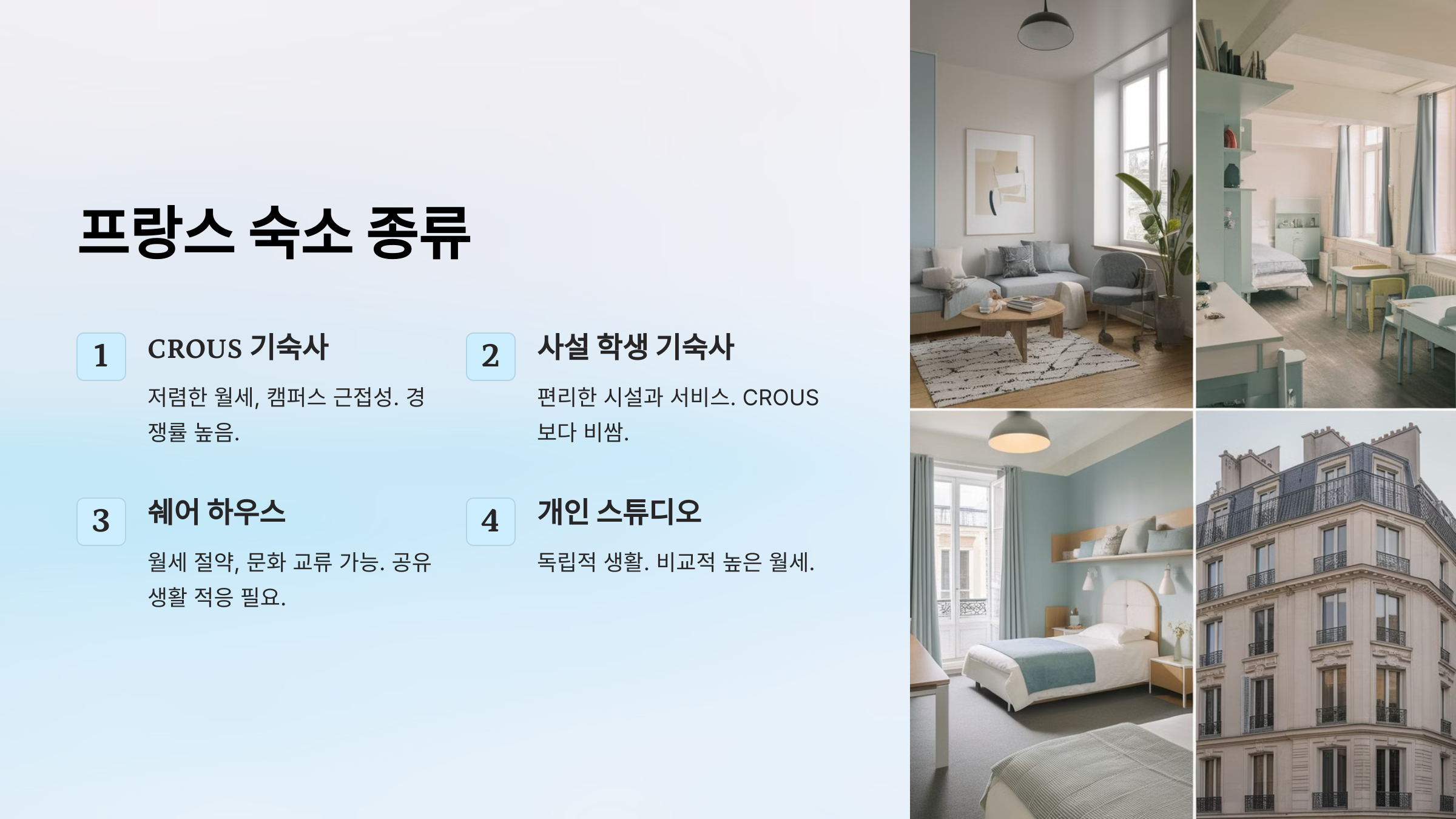 프랑스에는 유학생들이 선택할 수 있는 다양한 숙소 옵션이 있습니다. 본인의 예산, 생활 스타일, 학업 위치에 맞게 선택하세요.