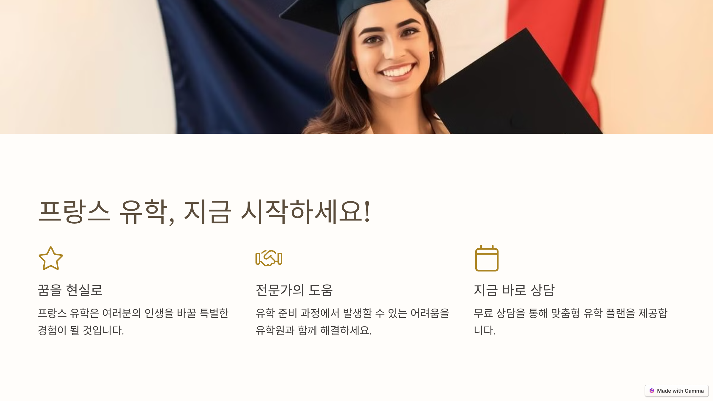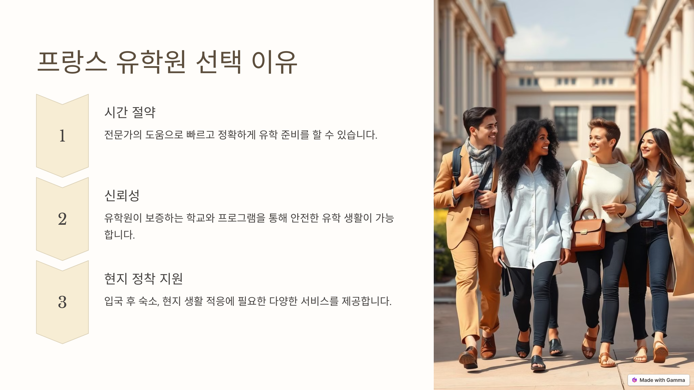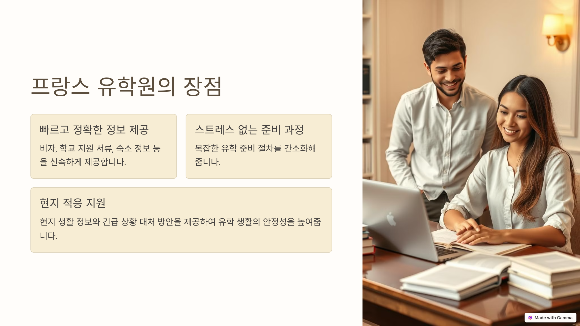 프랑스 유학은 여러분의 인생을 바꿀 특별한 경험이 될 것입니다. 유학 준비 과정에서 발생할 수 있는 어려움을 유학원과 함께 해결하고, 꿈꾸던 유학 생활을 시작해 보세요.