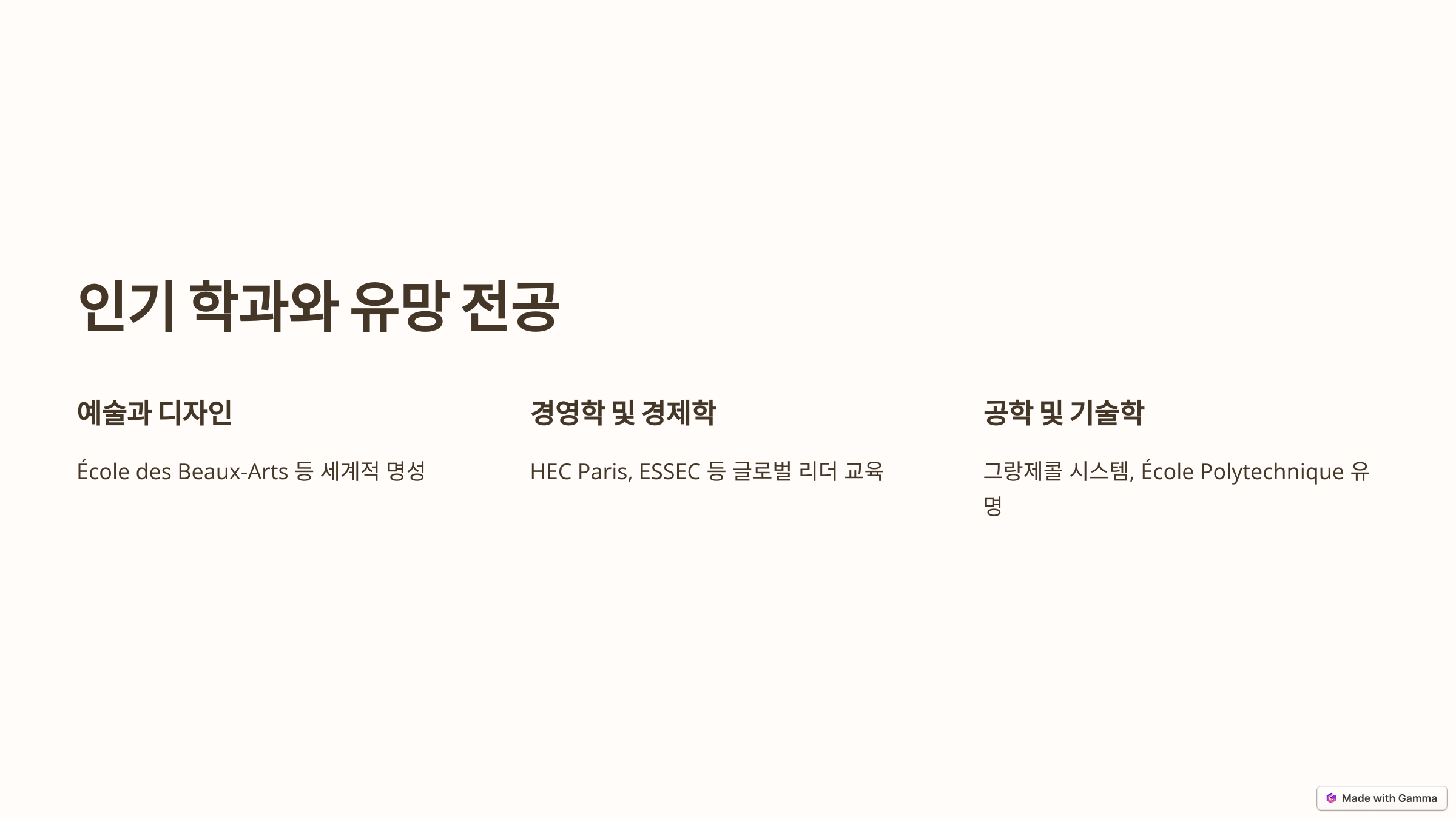 프랑스는 다양한 학문 분야에서 우수한 교육을 제공합니다. 특히 다음과 같은 학과들이 유학생들에게 높은 인기를 끌고 있습니다.