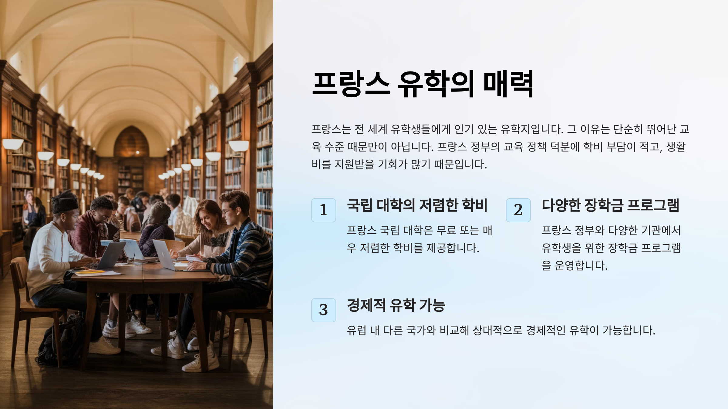 프랑스는 전 세계 유학생들에게 인기 있는 유학지입니다. 그 이유는 단순히 뛰어난 교육 수준 때문만은 아닙니다. 프랑스 정부의 교육 정책 덕분에 학비 부담이 적고, 생활비를 지원받을 기회가 많기 때문입니다.