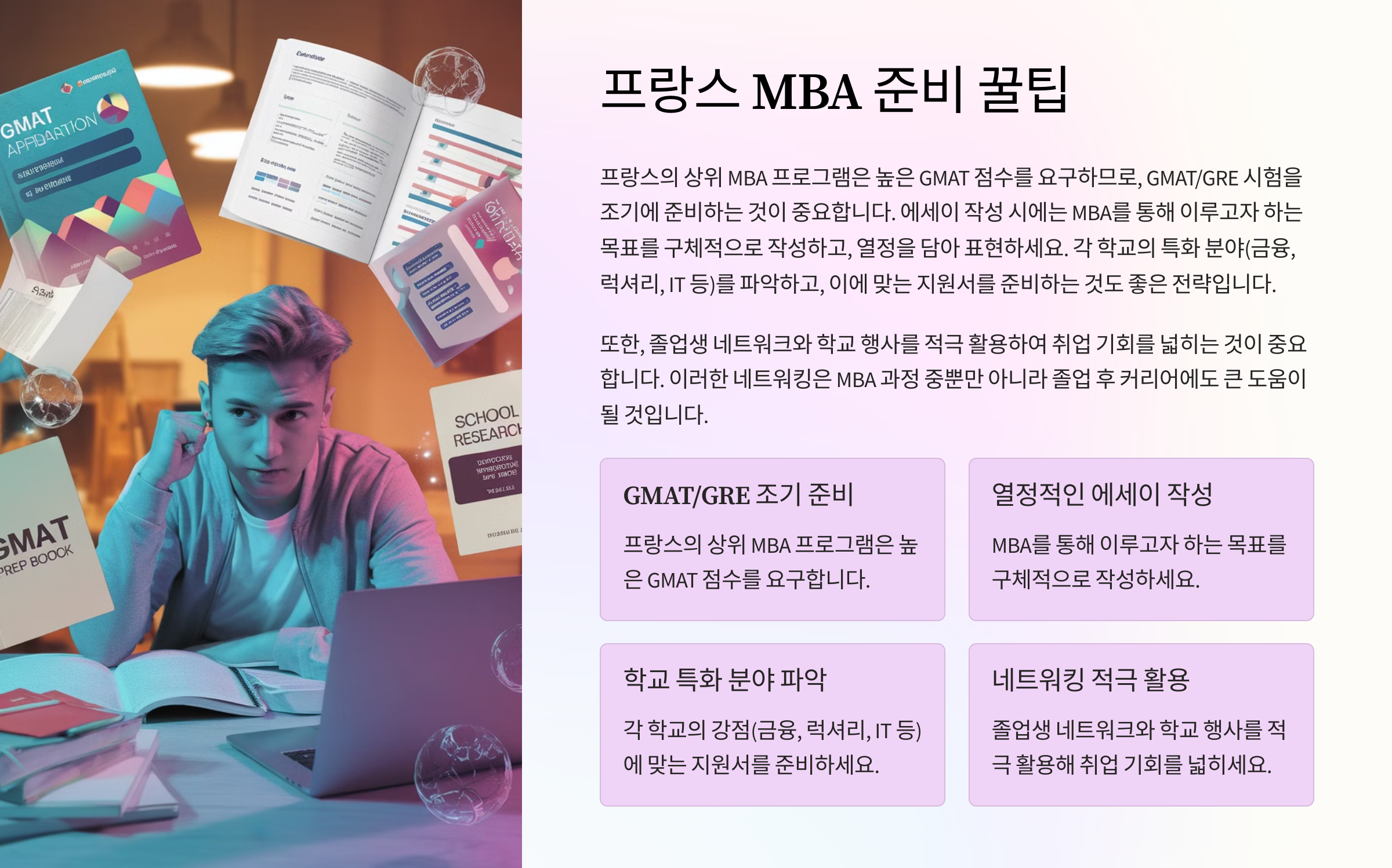 - GMAT/GRE 점수 제출 필수(INSEAD, HEC Paris 등).
