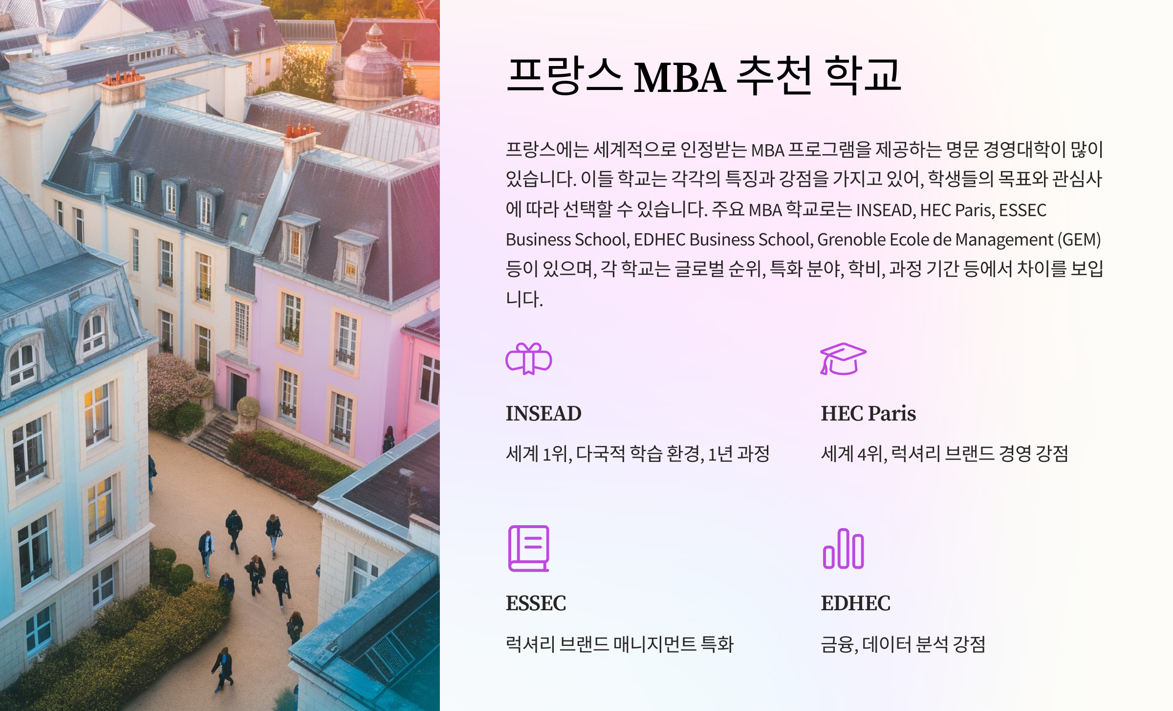 - 세계적 명성: INSEAD, HEC Paris와 같은 글로벌 톱 클래스 MBA 프로그램.