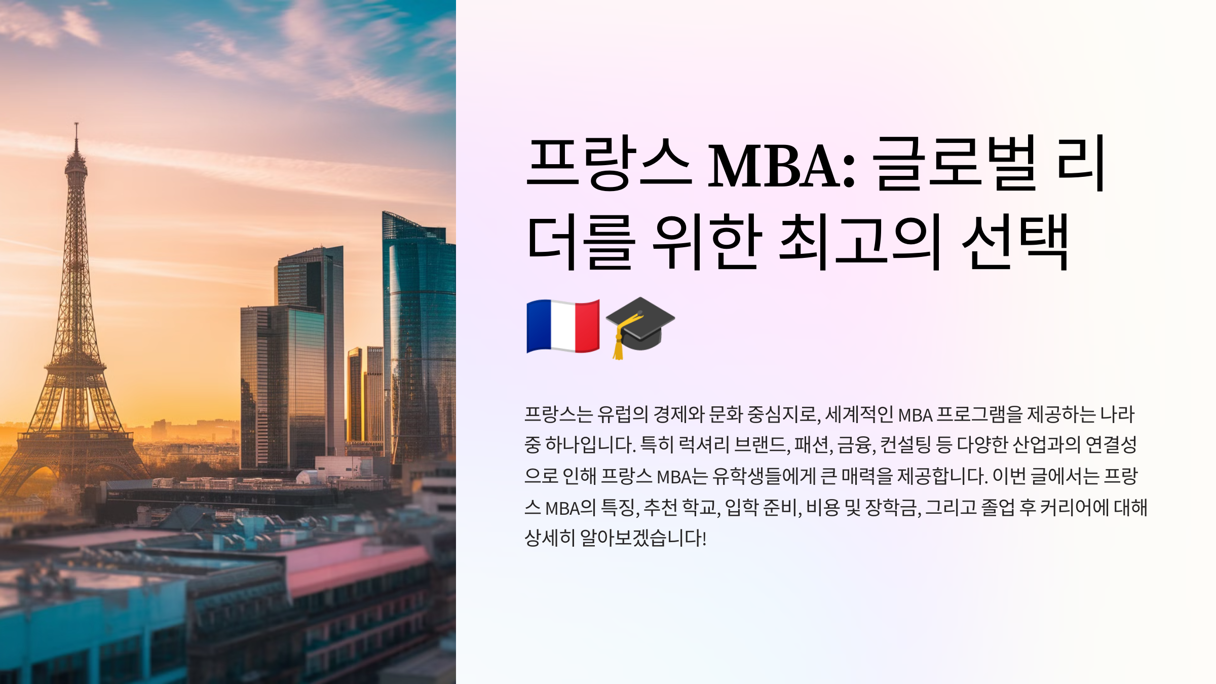 프랑스는 유럽의 경제와 문화 중심지로, 세계적인 MBA 프로그램을 제공하는 나라 중 하나입니다. 특히 럭셔리 브랜드, 패션, 금융, 컨설팅 등 다양한 산업과의 연결성으로 인해 프랑스 MBA는 유학생들에게 큰 매력을 제공합니다. 이번 글에서는 프랑스 MBA의 특징, 추천 학교, 입학 준비, 비용 및 장학금, 그리고 졸업 후 커리어에 대해 상세히 알아보겠습니다! 😊